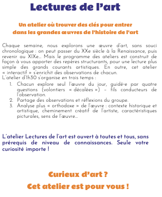 Dans les atelier histoire et lecture de l’art, il n’est pas question d’une fastidieuse approche académique.